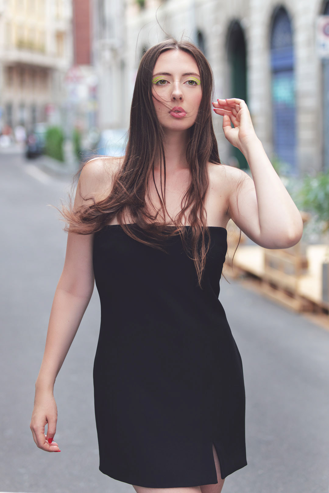 Durante la ricerca della modella e la preparazione per lo shooting, ci siamo concentrati su scatti che mettessero in evidenza il trucco in modo magistrale. Successivamente, ci siamo spostati all'esterno, sfruttando lo sfondo suggestivo di una Milano agostana deserta.